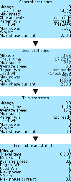To go from the main screen to the statistics section, double-click the left button of the On-board computer. Then, with the second and third buttons, you can switch screens with statistics General statistics > User statistics > Trip statistics > From charge statistics.