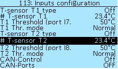 T1 Threshold (port I7) — I7 is a virtual port intended to function setup (see Function setup). Values from 0°C to 250°C, in 1°C increments.